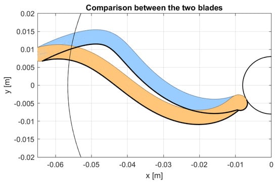 Since the motion law of the blade differs between the left-right and right-left movements (Figure 5a), the blades of the two compartments are different (Figure 5a), although they look very similar. A more intuitive comparison is depicted in Figure 8, where the right blade has been mirrored with respect to the vertical axis. The left blade, which corresponds to the range presents an evident sharp bend right before the cylinder edges, which corresponds to the last part of the rotary movement, during which the speed rapidly changes (range of Figure 5b). Such change is less evident in the other movement (), where can be seen a small spike in the rocker speed before returning to configuration 0. Moreover, the first movement presents a generally higher rocker speed, which increases the distance of the component from the horizontal axis, resulting in a blade that bends towards the top of the absolute reference system.