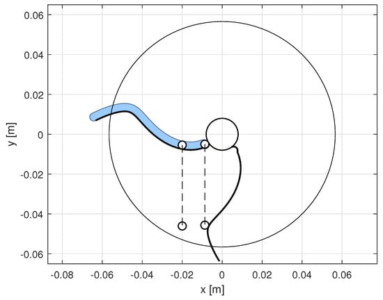 Finally, it has to be noted that the blade has been designed to be as close to the rotary distributor shaft to be as flexible as possible. In fact, in terms of speed, the initial part of the free falling motion is the slowest, since speed increases linearly with time; thus, the trajectory performed by a component adjacent to the shaft is the worst-case scenario in terms of possible interactions with the blade. Once the blade is designed with the component adjacent to the shaft, any other starting point on the blade ensures no interaction with the blade. An example is provided by Figure 9, in which a different starting point on the blade is considered. In here it can be seen that the component on the left, after a rotation of the blade, has a certain distance from the blade itself; the component whose falling starts in (component to the right), instead, perfectly follows the blade profile. As a result, any component that is placed on any other point on the blade will never interact with the blade and will fall by means of gravity.