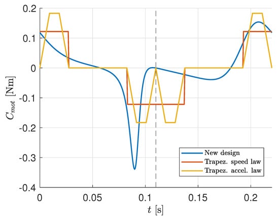 Motor torques for different design solutions. Proposed design (blue) and direct motor installed on the rotary distributor: trapezoidal speed law (orange) and trapezoidal acceleration law (yellow).