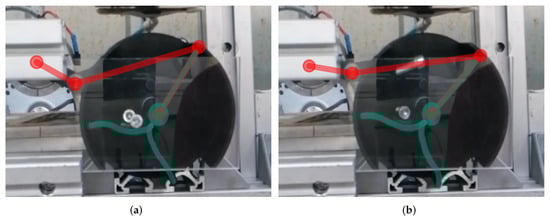Synthesis results are shown in Table 3 and in Figure 4. The configurations shown in Figure 4 repeat every crank rotation at specific q values. The main result of the synthesis is the mechanism reliability: in fact, since , there is a certain angle at which the rotary distributor can move without entering the top opening range. By imposing such angles via the precision points, it is ensured that the rocker enters the top opening range in a pre-determined timespan, which can be calculated by choosing the crank rotational speed. In our example, the mechanism is designed to rotate the rocker about from the dead points () when the crank rotates about about its axis (). The time needed for such rotation is: