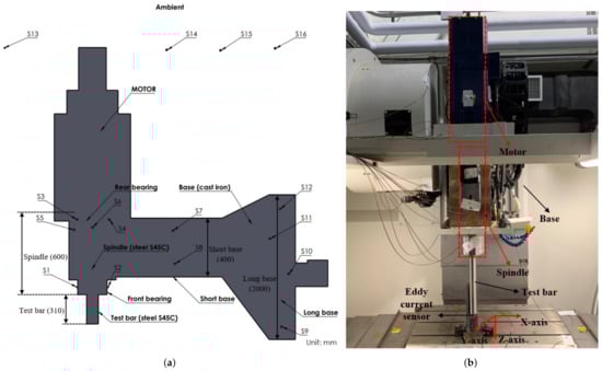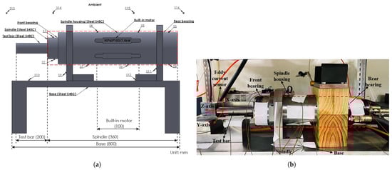 The outer dimensions of the standalone built-in spindle setup consist of a built-in spindle with a length (L) of 360 mm, a test bar with a length (L) of 200 mm clamped with the spindle, an in-built motor with a length (L) of 100 mm, a base length (L) of 800 mm, and one eddy current displacement sensor (AEC S-06) for the deformation measurement. Figure 1b shows the experimental setup of the standalone built-in spindle system.