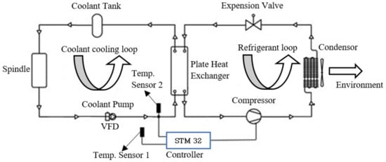 A cooling system with a coolant pump is developed to supply the coolant to the spindle for heat exchange. The system consists of two circulation loops (coolant cooling and refrigerant loops), as shown in Figure 3. The left loop is a coolant cooling loop consisting of a spindle, coolant storage tank, and coolant pump. Conversely, the right loop is a refrigerant circulation loop containing a compressor, condenser, expansion valve, and plate heat exchanger. The liquid refrigerant supplied by the compressor absorbs heat from the circulating coolant in the plate heat exchanger, evaporates into a gas, and then returns to the compressor in the refrigeration cycle. The gas refrigerant is compressed to high pressure before condensing into a liquid and then ejecting the condensation heat into the ambient environment from the condenser. After passing through an expansion valve, the pressure of the condensing liquid refrigerant decreases, and the refrigerant returns to the plate heat exchanger to complete the cycle. In the plate heat exchanger, the temperature of the circulating coolant decreases due to the heat released for refrigerant evaporation in the plate heat exchanger, and the low-temperature coolant is pumped to the rotating spindle to remove the heat generated during the working process. The ambient temperature detected by the temperature sensor (temp. sensor 1) is used to detect the ambient temperature variation and as a reference temperature for the supply coolant temperature setting. The coolant temperature sensor (temp. sensor 2) at the inlet of the plate heat exchanger is used to detect the coolant temperature and further adjust the driving frequency of the compressor by the STM32 PID controller to modify the refrigerant flow rate in the refrigeration cycle according to the cooling load variations of the spindle in order to maintain a stable and constant supply coolant temperature to the spindle. Figure 3 shows the operation of the cooling control system used in the standalone built-in spindle system and the CNC machine with a direct-drive spindle in this study.