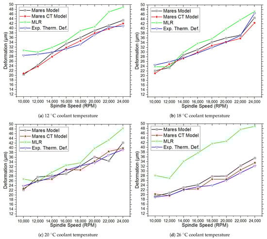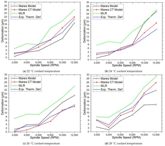 Figure 7 also shows that the MLR model prediction accuracy trends with spindle rotating speeds at different coolant temperatures and can also be used for thermal deformation prediction; however, the residuals between the MLR, Mares, and Mares CT models are large. The Mares CT model achieves greater accuracy improvements at different spindle speeds and coolant temperatures than the Mares and MLR models due to its consideration of the effects of coolant temperature on the MT.