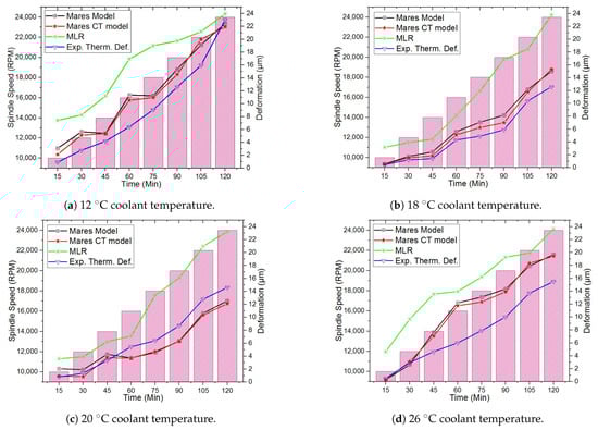 In a real machining process, the rotating speed of the spindle is not constant and varies with the machining product, machining mode, and cutting conditions. To validate the feasibility of the Mares, Mares CT, and MLR models in real machining processes, 15-min time intervals were used in the dynamic operation. Table 3 shows the dynamic operation at different coolant temperatures of 12 C, 18 C, 20 C, and 26 C. The experimental thermal deformations at different spindle rotating speeds of 10,000 to 24,000 rpm with 2,000 rpm intervals, increases with the increase in spindle rotating speed due to the spindle bearing heat generation increase with the increasing spindle rotating speed. However, the residual in the experimental thermal deformation between the Mares and Mares CT models shows that the Mares CT model achieves better prediction accuracy than the Mares model at different coolant temperatures and spindle speeds. The average prediction accuracy improvements are 16.59%, 35.35%, 15.59%, and 12.19% at coolant temperatures of 12 C, 18 C, 20 C, and 26 C, respectively. The Mares CT model () efficiency in the dynamic operations are 0.97, 0.99, 0.89, and 0.92 at different coolant temperatures of 12 C, 18 C, 20 C, and 26 C, respectively.