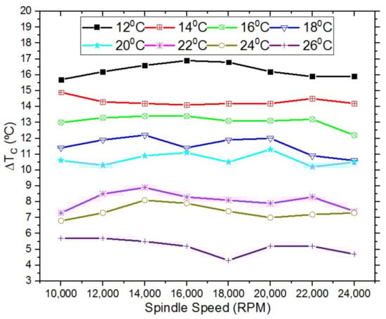 Figure 6 shows the differences in the inlet and outlet coolant temperatures at steady-state operation with different coolant temperatures and spindle rotating speeds. At the different coolant temperatures, from 12 C to 26 C at a constant flow rate of 5 LPM and a 26 C ambient temperature, coolant temperature differences are in the range of 16.9 C to 4.3 C and decrease as the coolant temperature approaches an ambient temperature.