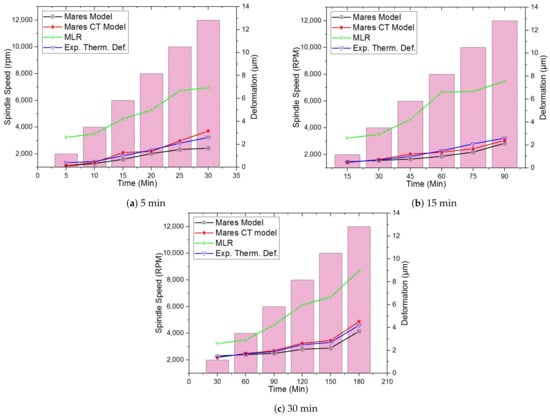 Figure 8 also shows that MLR model prediction accuracy worsens with increasing spindle rotating speeds at different time intervals of 5, 15, and 30 min; thus, the MLR model is suitable for lower spindle speeds because the experimental data used in the MLR analysis were measured at a spindle rotating speed of 6000 rpm. However, the residuals between the MLR, Mares, and Mares CT models are large. The Mares CT model achieves greater accuracy improvements at different spindle speeds and coolant temperatures than the Mares and MLR models due to the coolant temperature effect.