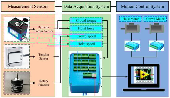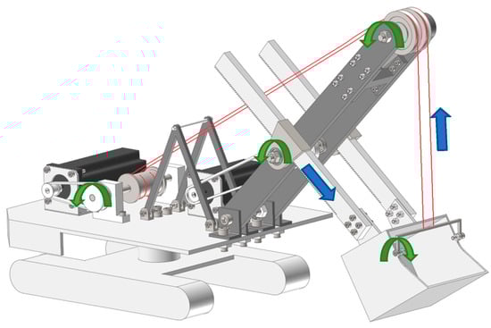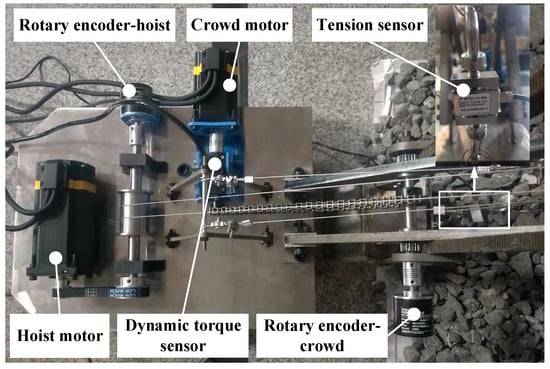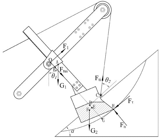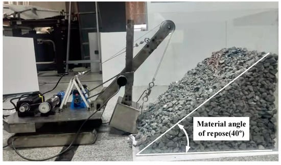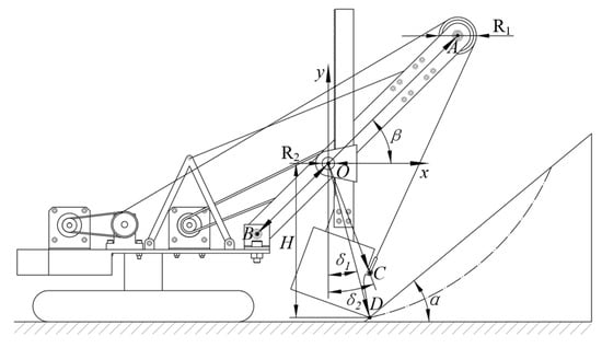 Structural parameters of the ECS scale model: R1—boom point sheave diameter; R2—crowd gear diameter; lAB—boom length; lOB, lOC, lOD—the distances from the rotation center of the saddle to the bottom of the boom, the hoist beam, and the tooth tip; H—height of saddle rotation center from tooth tip; α—material angle of repose; β—angle between boom and horizontal direction; δ1, δ2—angle between lOD, lOC and the parallel direction of the dipper handle.