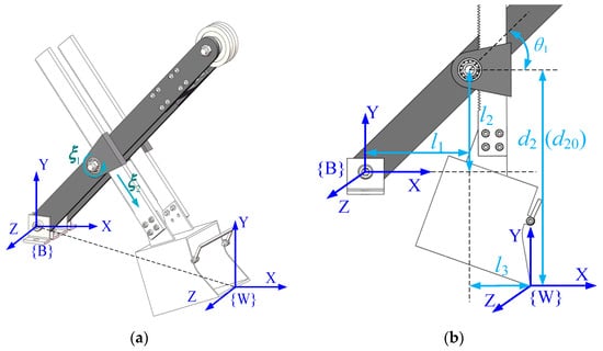 Establishment of the coordinate system of the scale model: (a) general posture; (b) initial posture (–horizontal and vertical distance from the saddle rotation center to the origin of coordinate system {B}; –the distance from the saddle rotation center to dipper tooth tip in vertical direction of the dipper handle; –the dipper handle rotation angle; –the dipper handle elongation; –initial value of the dipper handle elongation).