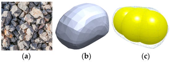 Establishment of particle models: (a) The limestone particles; (b) 3D model of the limestone particles; (c) The material particle in EDEM.