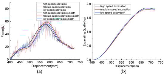 | Different Excavation Conditions | Maximum Excavating Resistance/N | Relative Deviation/% | Maximum Excavating Resistance Occurrence Time/s | Relative Deviation/% | Correlation Coefficient (R2) |