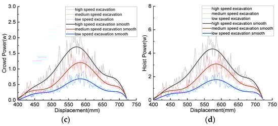 Comparison of simulation results under different speed combinations: (a) Excavating resistance; (b) Excavating quality; (c) Crowd power; (d) Hoist power.
