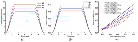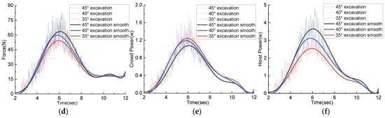 Comparison of simulation results under different stacking angles: (a) Crowd speed; (b) Hoist speed; (c) Excavating trajectory; (d) Excavating resistance; (e) Crowd power; (f) Hoist power.