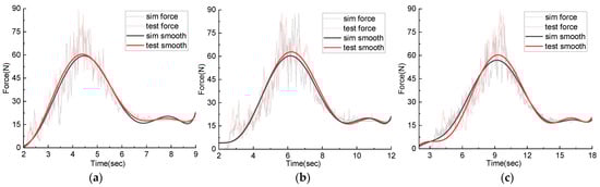 Comparison between simulation data and experimental data of excavation resistance under different speed combinations: (a) High-speed excavation; (b) Medium-speed mining; (c) Low-speed excavation.
