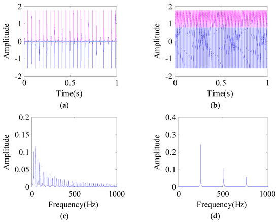 Due to the random sliding of the rolling element, the performance of the bearing fault impact signal in the time domain is not strictly a periodic signal, with periodic time-varying characteristics, non-stationary characteristics, and a cyclostationary signal. Therefore, after the bearing fault occurs, the performance in the time domain has impact and cyclostationarity. Through the above calculation formula of bearing fault characteristic frequency, combined with the simulation in Figure 4 generated by the bearing parameter information of Schaeffler (FAG), it can be found that when the bearing is rotating at low speed, the impact is stronger in the time domain; that is, the impact signal generated is sparse, as shown in Figure 4a, and the spectral line signal in the envelope spectrum is dense, as shown in Figure 4c. When the bearing is in high-speed rotating motion, the cyclostationarity is stronger in the time domain, and the impact signal is denser, as shown in Figure 4b. The spectral lines in the envelope spectrum are sparse, as shown in Figure 4d.