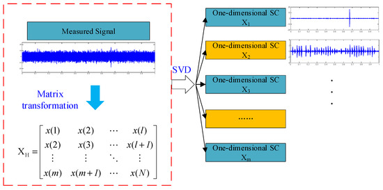 The specific process of singular value decomposition is shown in Figure 5. For one-dimensional vibration signal X = [ x 1 , x 2 , x N ] , the one-dimensional vibration signal must be converted into a matrix before singular value decomposition can be carried out [31,32]. At present, there are two ways to transform the matrix. The first is to construct a Hankel matrix, as shown in Figure 5, where m is the embedded dimension of the matrix, and m + l 1 = N . The other is to construct the matrix by periodic truncation. As shown in Formula (5), t is the truncation period, and k t N .