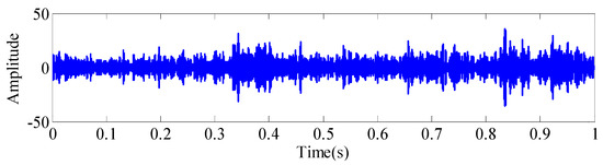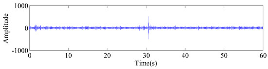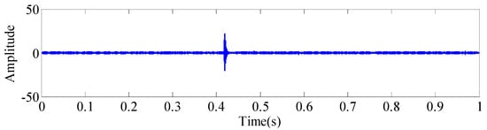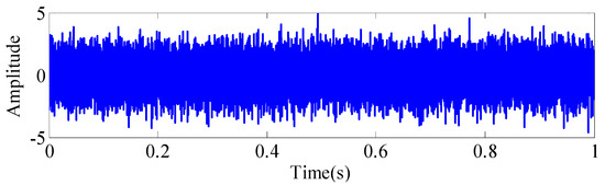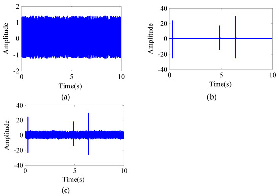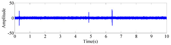 To verify the effectiveness of the algorithm, first construct a simulation signal through Formula (7), as shown in Figure 6. This includes repetitive transient impulse caused by bearing failure, high amplitude impulse interference caused by rail short wave defects, and Gaussian white noise.