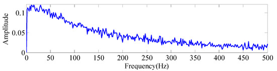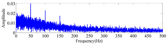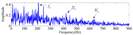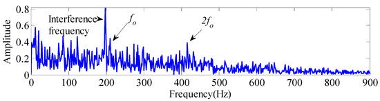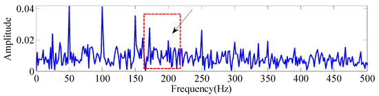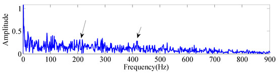 Envelope demodulation is one of the most commonly used methods for fault diagnosis. First, envelope demodulation analysis is carried out on the 10 s clock data collected, as shown in Figure 7. From the envelope spectrum, it can be seen that near the fault characteristic frequency, the spectral line is wrapped by other interference frequencies, and the octave spectral line is not very clear. The envelope spectrum is seriously interfered with by noise and high amplitude impulse.