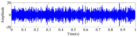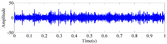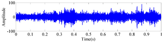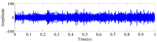 By selecting one of the above experimental conditions, namely 1800 r/min rotating speed and no-load experimental conditions, the performance of the pre-identification via singular value decomposition algorithm is verified. The time domain diagram of the collected vibration signal is shown in Figure 19. According to the bearing fault frequency calculated at the above different speeds, in view of the disadvantage of full signal section comparison in the above simulation signals, the experimental signals are mainly compared with the random selection and the manual visual selection.