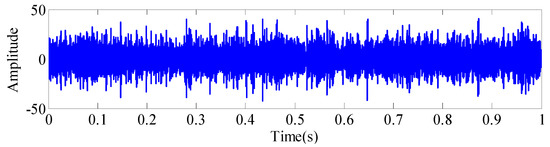 where x ( t ) represents the impulse fault signal, δ ( t ) represents a single high amplitude impulse, and n ( t ) represents Gaussian white noise. Set the sampling frequency to 25,600 Hz, the sampling time to 10 s, and the attenuation rate λ to 550. The bearing fault characteristic frequency is 50 Hz, and the simulation signal is as shown in the figure below, where τ k is the random sliding of the rolling element set at 2% of the fault cycle. A k is the amplitude of bearing fault impulse, which is set as random distribution, with a range of 1.32~1.72. n ( t ) is Gaussian white noise, and the signal-to-noise ratio is −10 dB.