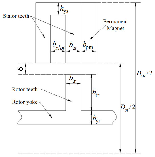 where is the current density, is the cooper fill factor, is the area per slot, , , , and are the slot open width, tooth width, permanent magnet width, and yoke height of each stator pole, respectively. is the outer diameter of the stator core.