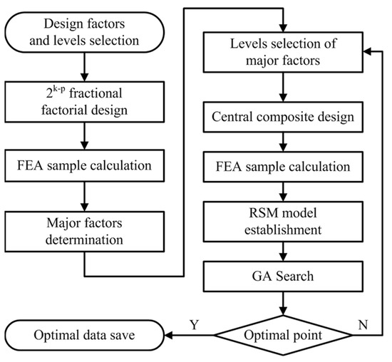 With the initial calculated parameters, a 3D-FEA based on ANSOFT MAXWELL software was employed to analyze the electromagnetic performance of the FSPM motor. The switching magnetic field exhibits nonlinear flux leakage and saturation in the flux-switching topology [21,22], which significantly affects the output performance of the FSPM motor. On the other hand, considering the growing price of rare earth permanent magnets (PMs), the optimal amount of PM becomes an important factor for the cost control of an FSPM motor. Therefore, the dimensions of the FSPM motor were optimized by response surface methodology (RSM) and a genetic algorithm (GA) based on FEA. RSM was used to establish the relationship between the input factors and output responses through the statistical fitting method. In this work, the dimensions of the FSPM motor are the input factors, output torque Tout, and torque ripple Trip, and the ratio of the output torque-to-PM mass Tout/Qpm represents the output responses. Three-dimensional FEA was employed to calculate the output responses with the variations of the input factors. A GA is an optimization algorithm imitating the natural process of biological evolution, which combines theories of “survival of the fittest” and “random exchange”. In this work, GA was used to search for the optimal point of the RSM model. The optimization process is illustrated by the flow chart in Figure 4.