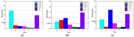 Pareto chart of the sensitivities to output performance. (a) Sensitivities to Tout; (b) sensitivities to Tript; (c) sensitivities to Tout/Qpm.
