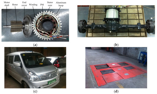 Experimental setup. (a) Prototype of FSPM; (b) drivetrain with FSPM motor; (c) CEV with FSPM motor; (d) experimental bench for vehicles.