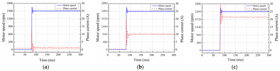 In order to investigate the driving capacity of the FSPM drivetrain, the CEV was tested on the vehicle test bench with different resisting torque. The motor was operated at the rated speed (2400 rpm) with different resisting torque (0, 30, and 65 N·m) for a short time test. Figure 7 shows the dynamic speed and phase current of the FSPM under different conditions. In the case of no-load, as shown in Figure 7a, the phase current was around 2 A in the steady state. This is caused by motor losses and mechanical resistance. In the cases of the 30 and 65 N·m loads, the phase current values increased to around 10 A and 22 A, respectively, as shown in Figure 7b,c. This result suggests that the designed drivetrain with the FSPM can work at a rated torque for a long time. Meanwhile, the result also demonstrates that the FSPM can be operated at maximum torque for a short time. In addition, there is an approximate linear relationship between the phase current and the load torque. This indicates that the drive system with the FSPM has less performance loss under overloaded conditions, and it is suitable for practical applications with frequently overloaded conditions.