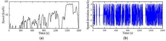 Driving cycle of the experimental test. (a) Speed curve of CLTC-C standard; (b) speed deviation during the test of FSPM.