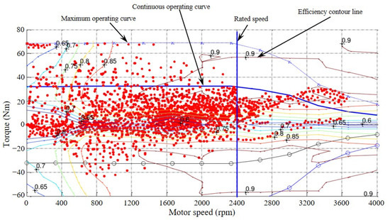 Figure 9 shows the distribution of the FSPM motor operating conditions during the CLTC-C test. It can be seen that most of the operating condition points are distributed below the rated torque and rated speed. This result indicates that the designed FSPM drive system can meet the power demand during the actual use of a CEV. However, it was also found (from Figure 8) that some of the points are distributed above the continuous operating curve and rated speed. Specifically, the points which are located above the continuous operating curve account for around 9.47% of the total points, and the points which are located above the rated speed account for around 13.86% of the total points. The experimental results show that the CLTC-C condition requires the drive system to have a remarkable capacity for overload and over-speed. In addition, the efficiency of the FSPM drive system is also reflected in Figure 9. The efficiency contour lines divide the two-dimensional plane operating condition into different areas, representing different efficiency values of the FSPM drive system. Most of the points are located in the areas of 0.7 to 0.9. This result suggests that the nominal average efficiency of the FSPM drive system was between 0.7 and 0.9 during the whole CLTC-C test.