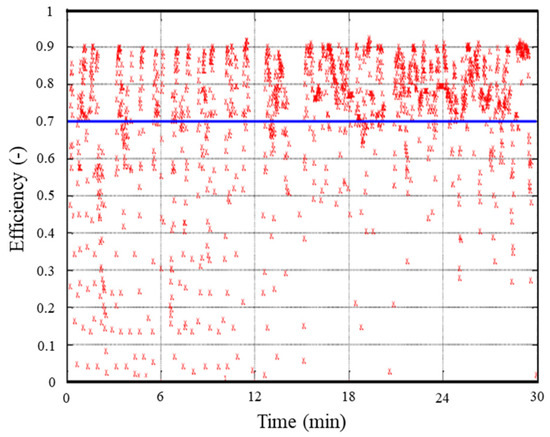 In order to further discuss the efficiency distribution of the FSPM drive system, the efficiency values corresponding to the operating condition points are plotted in Figure 10. It can be seen that the data points are gathered in the region of 0.7 to 0.9. If the efficiency interval (0.7, 1) is selected as the high-efficiency operating condition, the high-efficiency running time of the FSPM drive system accounts for about 84% of the total time during the CLTC-C test.