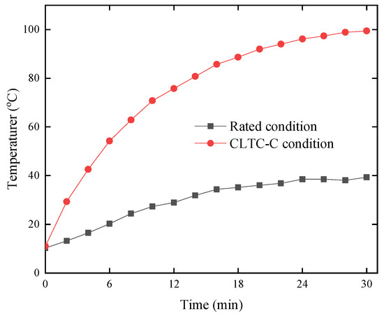 Figure 11 shows a comparison of the motor temperature between the rated condition test and CLTC-C test. The experiments were carried out in the winter (Shaanxi, China). The environment temperature was about 11 °C at the start of the experiments. It can be seen from Figure 11 that the temperature of the FSPM motor increased slowly with operating time in the rated condition; however, it increased rapidly in the CLTC-C condition. This result indicates that the overload and over-speed conditions in the CLTC-C cycle can cause severe heat generation in the FSPM motor, which should be fully considered in practical applications regarding CEVs. In this study, the temperature rise was around 90 °C after the 30 min CLTC-C test. This is negative to the service life of the FSPM drive system. The temperature measurement result suggests that a specialized cooling system should be designed for a CEV with an FSPM drive system. In particular, the concentrated windings of the FSPM motor are all in the stator. When considering this structural feature, a liquid cooling method may be feasible and necessary for the practical application of an FSPM drive system in a CEV. It is important to emphasize that all tests were carried out under simple free-air cooling conditions, which is worse than real-life driving. We are considering setting up a new test bench to simulate real life driving conditions in our next steps.