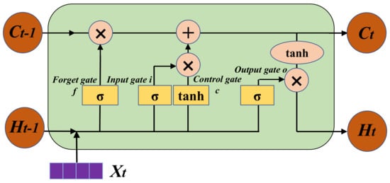 LSTM is a variant version of RNN that is suitable for time series analysis, and it adopts a gating mechanism to effectively tackle the vanishing and exploding gradient issues in the training process. There are four gates named forget gate f, input gate i, control gate c, and output gate o in the memory cell of the LSTM. The basic structure of the LSTM cell is given in Figure 1, and it is composed of the output of previous memory cell , the input signal at each time step , the output of current memory cell , the output of previous hidden unit , and the output of current hidden unit . The forget gate decides how the contribution of the previous moment should be obtained, which will generate a value in the range of 0-1 for each data point in the . The input gate controls how much input from the current moment will be kept in the memory cell. The control gate is used to manage the update process of the memory cell contents from to by accounting for the output of f and i. The output gate determines how much the internal state at the current moment affects the external state. The symbol ⊗ indicates the multiplication of vector elements, ⊕ indicates the sum of vectors, and indicates the operation of activation function. The mathematical expression of the update process for the LSTM’s four gates are given as follows: