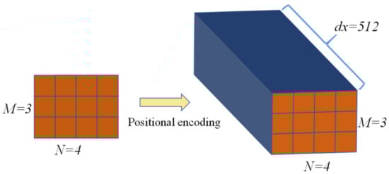 The positional encoding in each dimension corresponds to a sinusoid and the wavelength is a geometric progression from 2π to 10,000−2π. The position information is composed of sine and cosine functions of different frequencies alternating with each other. In practice, the sequence after positional encoding is obtained by summing each vector in the input sequence with the corresponding position information. It should be noted that the dimension of the input sequence increases dramatically after the positional encoding operation. Assuming that the dimensions of the input data are M × N, M is the number of data samples and N is the number of data points in the samples. The dimensions of the input data increase to M × N × dx after the positional encoding. When M = 3 and N = 4, the dimensionality increase process of positional encoding is shown in Figure 5. The degradation of mechanical equipment is a long-term process, and the collected sample signals are usually long-time sequences. That is to say, the values of M and N are often very large. As a result, the data dimension after the positional encoding increases significantly, and the number of model parameters increases dramatically, which makes the Transformer training very difficult and prone to overfitting and other problems. For this reason, this paper proposes to use the ConLSTM network to extract the low-dimensional spatiotemporal feature vectors from the long-time degradation sequence, which effectively reduces the amount of data fed into the Transformer network.