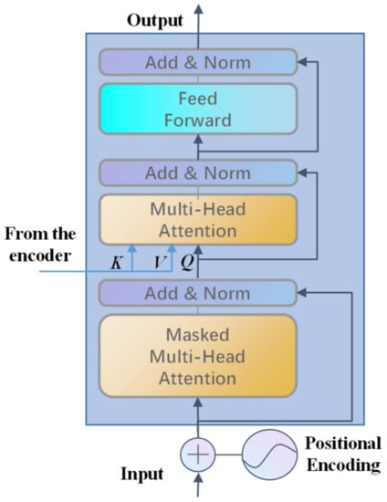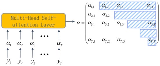 The structure of a decoder is presented in Figure 6. Different from the encoder, the first layer of the decoder is the masked multi-head attention, which is implemented by the masking operation. The purpose of the masking operation is to make the decoder only focus on the input sequence at the current moment and the previous moments. The realization process of the masking operation is to generate an upper triangular matrix and set the values of the upper triangle to zero and apply this matrix to cover each sequence and achieve the purpose of concealing the future information. It works by adding to the multi-head attention to prevent each position from appearing in future positions, which effectively avoids the auto-regressive property. The process of the masking operation is given in Figure 7. The input data of the decoder are , and the result after positional encoding is in the figure. The shaded part of the matrix processed by the multi-head self-attention layer is the upper triangular matrix, and the covered values are all set to zero. After that, the flowed information is processed by lay normalization as the query Q and the output of the previous encoder as the key K and value V, which are fed together into the next multi-head attention layer and finally output by a fully connected feed-forward network.