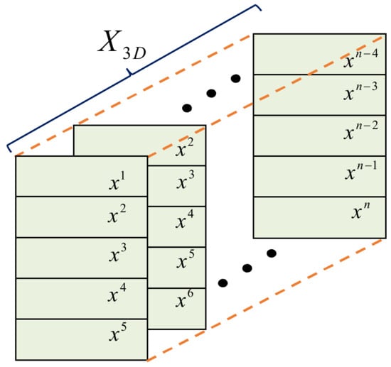 where k is the serial number of the raw 1D bearing signal sample and t is the time step. The time step of the proposed method is set to t = 5 according to the literature [14]. The 3D input data that is fed into the ConvLSTM network is composed of multiple single-channel matrices. The 3D input data of the proposed method is shown in Figure 8. The number of the 3D data channel is set to n − 4, and n denotes the number of the raw 1D bearing signals.