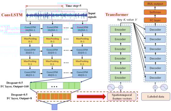 The architecture of the proposed ConvLSTM-Transformer model is shown in Figure 9. The ConvLSTM network consists of three ConvLSTM layers, two max pooling layers, and three FC layers. The first ConvLSTM layer with a convolutional kernel size of 64 × 1 is designed to extract spatiotemporal features of the input signals using a larger receptive field, followed by two ConvLSTM layers with a small convolutional kernel size of 3 × 1 to extract more detailed spatiotemporal feature information. The first two ConvLSTM layers are followed by a max pooling layer, which can further compress the data dimension and reduce the number of network parameters. At the end of the network are three FC layers, in which the second FC layer contains eight neurons and its output is considered to be the spatiotemporal feature vectors that are fed into the Transformer network. In addition, the Dropout layer is added to the FC layers to enhance the robustness of the network and avoid overfitting. The parameters of the ConvLSTM network are upgraded by minimizing the training error, and the optimization process of the network model employs the Adam algorithm. The Transformer network is composed of six sequentially stacked encoder blocks and six decoder blocks. The spatiotemporal feature vectors obtained by the ConvLSTM network are fed into the encoder block, and the ratio of the actual RUL values of each sample signal to their respective whole lifetime is fed into the decoder block as the labeled data. In practice, it is necessary to normalize the labeled data to be in the range of [0, 1] to eliminate the influence of different bearings with very wide ranges of a lifetime. The end of the Transformer network is an FC layer that outputs the RUL prediction result using the softmax function. The training process of the Transformer network is equivalent to solving a supervised multi-classification problem. The Mean Square Error (MSE) is calculated as a loss function of the Transformer during training, and the Adam algorithm is chosen to minimize the training error by iteratively updating the network parameters.