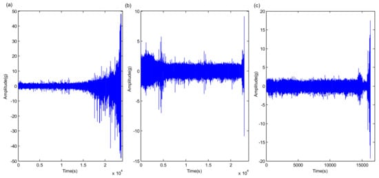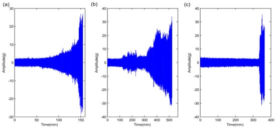 The temporal waveforms of whole-life signals in XJTU-SY dataset. (a) bearing1_3; (b) bearing2_3; (c) bearing3_3.