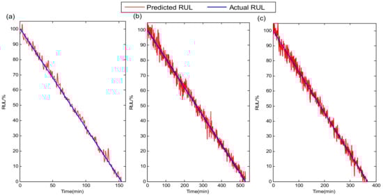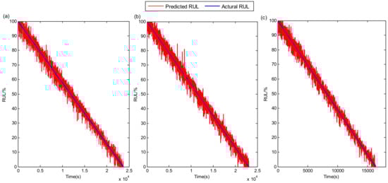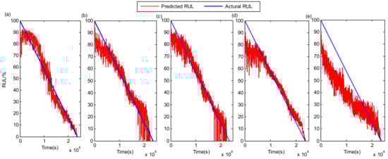 The temporal waveforms of whole-life vibration signals for the three tested bearings under different operation conditions are given in Figure 13. It can be seen from the figure that even for the same type of bearings, their life ranges and waveform amplitude variations are very different under three operating conditions. RUL results of the above three tested bearings using the proposed method are shown in Figure 14. Although the number of signal samples collected for each tested bearing in the XJTU-SY bearing dataset is smaller than in the PHM 2012 bearing dataset, it can be observed that the proposed method still gives accurate RUL prediction results for the tested bearings. It further confirms that the proposed method could achieve high performance for different bearings under various operating conditions.