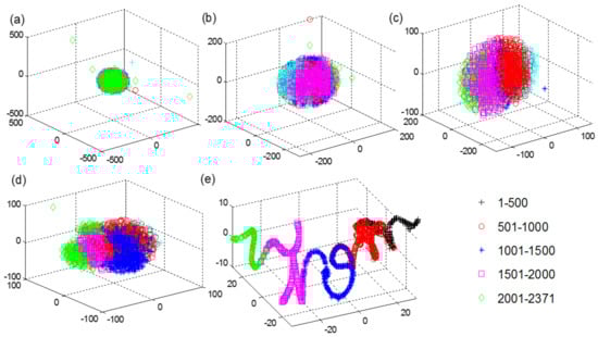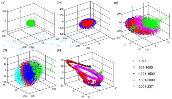 To better investigate the distribution characteristics of the spatiotemporal features extracted by the proposed ConvLSTM network for the long-time degradation signals, a nonlinear dimensionality reduction method named t-distributed stochastic neighbor embedding (t-SNE) algorithm [33] is used to generate three-dimensional (3D) representations of high-dimensional feature maps at different hidden layers of the ConvLSTM network. The signal samples of Bearing1_3 in the PHM 2012 dataset are selected for visualization analysis. There are 2731 signal samples in the whole-life period of Bearing1_3 after the operation of five time-step embeddings, and all the signal samples are divided into five groups according to chronological order. The visualization results of the high-dimensional features at the network input, ConvLSTM1 layer, ConvLSTM2 layer, ConvLSTM3 layer, and the second FC (FC2) layer of the proposed ConvLSTM network are shown in Figure 15. The dots with different colors and different types in the figure represent five different clusters of all the signal samples. At the input of the ConvLSTM network, all the feature dots are completely gathered together and cannot be identified. With the increase in the network layers, these feature dots corresponding to different sampling times start to be separated gradually until the last FC2 layer. Although there are still slight pieces of overlap, the majority of dots are clearly separated and clustered together in chronological order, which confirms that the proposed ConvLSTM network is capable of learning the spatiotemporal correlation features from the long-time degradation sequences of bearing.