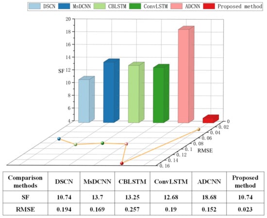 In this section, five state-of-the-art network modules are used to predict the bearing RUL for exhibiting the superiority of the proposed method, including deep separable convolutional network (DSCN) [14], multi-scale deep convolutional neural network (MsDCNN) [34], convolutional bi-directional long short-term memory network (CBLSTM) [35], the proposed ConvLSTM network, and attentive dense convolutional neural network (ADCNN) [36]. The RUL prediction results of the above comparison methods for the tested bearing1_3 in the PHM 2012 dataset are given in Figure 18. Compared with the RUL result of the proposed method in Figure 10, although the overall tendencies of the RUL estimations for all the methods are consistent, it can be observed that the predicted result of the proposed method is most similar to the actual RUL result. Two commonly used evaluation metrics in the field of RUL prognostics, the scoring function (SF) and root mean square error (RMSE) [13,14,34,35], are employed to quantitatively assess the accuracy of the RUL prognostic result for the above methods. The RUL prediction result is more accurate with a lower SF value and RMSE value. The literature [14] provided a full explanation of how the two metrics were calculated. It should be noted that each test was repeated five times to improve the reliability of the RUL prediction results, and all the metric values appearing in this paper are the average of the five test results. The SF and RMSE results of the above five methods are shown in Figure 19. It can be clearly observed that the proposed method in this paper has the smallest RMSE and SF values compared to the four comparison methods, and the gaps of SF values and RMSE values with the four comparison methods are very significant, which confirms that the proposed ConvLSTM-Transformer method has higher accuracy in bearing RUL estimation.