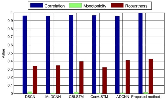 To further comprehensively evaluate the RUL prediction performance of the above five prognostic models, three evaluating functions, correlation, monotonicity, and robustness, are chosen to study the RUL prediction results of different methods. Correlation describes how the prediction result varies with time, monotonicity reflects the increasing or decreasing trend of the prediction result, and robustness represents the variability of the prediction result with random fluctuations. The larger the three evaluating functions, the better the comprehensive performance of the prognostic model. These three evaluating functions can be computed as follows, and detailed information about them can be found in the literature [37].