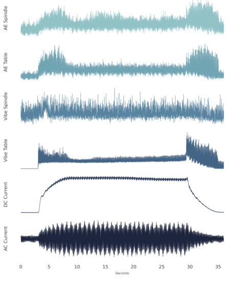 Six signal types were collected during each cut: acoustic emission (AE) signals from the spindle and table; vibration from the spindle and table; and AC/DC current from the spindle motor. The signals were collected at a sampling rate of 250 Hz, and each cut has 9000 sample points, for a total signal length of 36 s. All the cuts were organized in a structured MATLAB array as described by the authors of the dataset. Figure 4 shows a representative sample of a single cut.