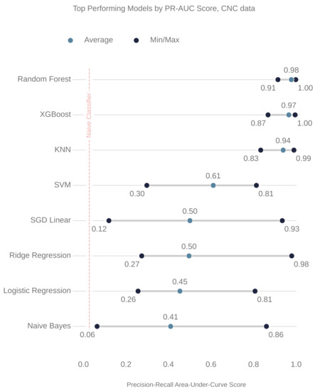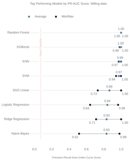 In total, 73,274 and 230,859 models were trained on the milling and CNC datasets, respectively. The top performing models, based on average PR-AUC, were selected and then analyzed further.