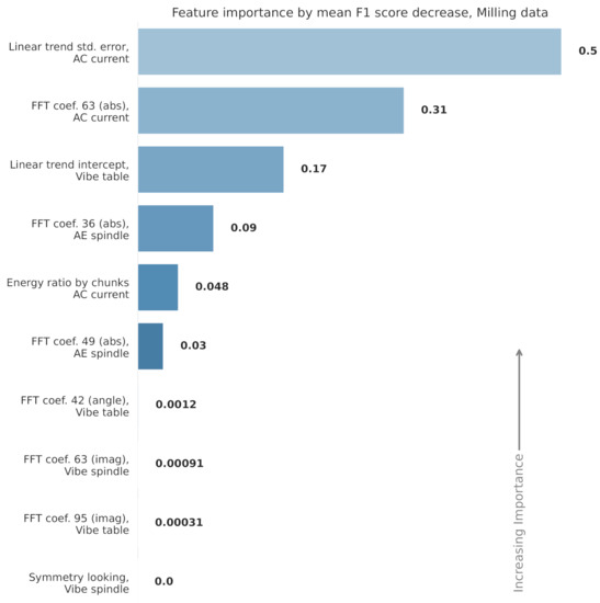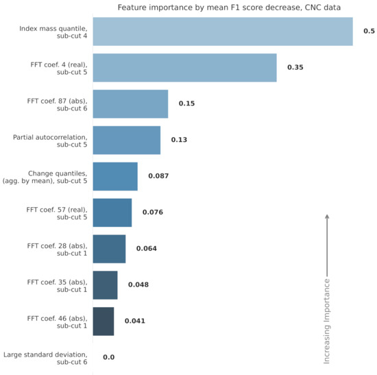 The experiments on the CNC and milling datasets were conducted using the Python programming language. Many open-source software libraries were used, in addition to tsfresh, scikit-learn, and the XGBoost libraries, as listed above. NumPy [35] and SciPy [36] were used for data preprocessing and the calculation of evaluation metrics. Pandas, a tool for manipulating numerical tables, was used for recording results [37]. PyPHM, a library for accessing and preprocessing industrial datasets, was used for downloading and preprocessing the milling dataset [19]. Matplotlib was used for generating figures [38].