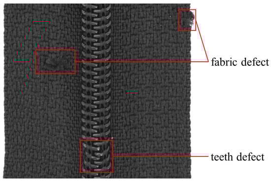 Lack of exploration of the generation of non-uniform complex structure defects with binary annotations. There are multiple semantic regions in a non-uniform structure image, where texture features are different and the corresponding defects are distinct. As shown in Figure 1, there are two types of textures in a zipper image: fabric and zipper teeth, whose defect contents are significantly disparate. In terms of such non-uniform structure images, networks must generate conforming defects at the specified locations, to obtain realistic synthetic results. In addition, obtaining binary annotations for the generated complex texture defect images is also a challenging task. Shuanlong N. et al. [] used random seeds to construct input masks, while this is limited to simple stripe defects in some uniform textures. Du-Ming T. et al. [] adopted two CycleGANs to preserve normal backgrounds and threshold segmentation to obtain binary annotations. However, this work also only synthesized defects with uniform textures, and the overall networks contained four generators and four discriminators, which were too complicated.
