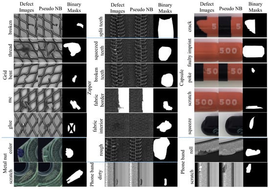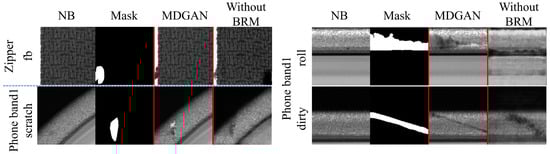 MDGAN was trained for each type of defect under each item. We augmented the training image pairs by rotation, flipping, and random cropping. The binary mask was normalized to [−1, 1] when inputting to the MDGAN and [0, 1] when calculating losses. The number of output channels of the 12 convolution layers of the generator from input to output were 64, 128, 256, 256, 512, 512, 512, 256, 256, 128, and 64, respectively; those of the discriminator were 32, 128, 256, 256, 512, and 1, respectively. The dimension of latent space was 8, and the hyperparameters of Equation (15) were set as , , , and . The Adam optimizer was used with = 0.5, = 0.999 to train MDGAN, with a batch size = 20 and learning rate = 0.0004. We trained the MDGAN for 500 iterations on one NVIDIA GeForce RTX 3090 GPU of a sever with Intel(R) Xeon(R) Gold 622306R CPU @ 2.90 GHz. During training, backgrounds could be retained without the last BRM in some datasets, which could simplify the architecture and obtain a better transition between normal backgrounds and defect regions. Therefore, we eliminated the last BRM in the defects of the grid.