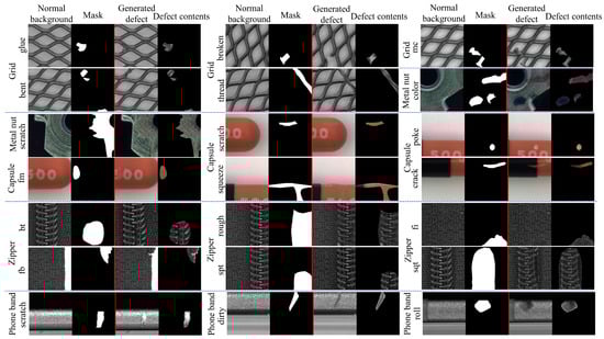 Some synthetic defect samples are shown in Figure 5 and Figure 6. As shown in Figure 5, MDGAN achieved defect image generation for all categories. Good synthesis results were obtained for complex and weak defects, such as the fine-grained texture defects (zipper-fb, zipper-fi, grid-thread, etc.), color defects (metal nut-color), metallic defects (grid-mc), and weak defects (phone band). As seen from the Defect contents in Figure 5, the generated defect contents were realistic and accurately distributed in the locations marked by the mask, achieving an accurate correspondence between the synthetic defect images and the input binary masks. In addition, MDGAN preserved the background structures in the Grid reasonably well, despite canceling the last BRM. In summary, with the help of BRM and DDM, MDGAN was able to generate realistic defect images, while preserving the original real backgrounds outside the annotations and achieved a natural transition between generated defects and real background, so that the generated defect images were accurately labeled by input binary masks.