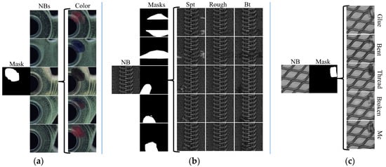 Controllability of the backgrounds, defect shapes, and defect textures. We separately processed these three aspects, to verify that MDGAN could generate various defect images for a normal background and obtain accurate annotations. Figure 6 shows the generated results when normal backgrounds, defect shapes, and defect textures were changed, respectively. First, the defect images in Figure 6a shared the same binary mask. This shows that BRM added different backgrounds to the generator, to obtain multiple defect samples, whose annotations were the same, and the defects varied with the background. Second, Figure 6b shows the generated defect images of the zipper, with the same background NB and five different masks. Defect images in the same row shared the same mask on the left side. It can be seen that the BRM could replace different background regions with different masks, which assisted MDGAN in generating multiple defects with different shapes and contents on the same normal image. Third, Figure 6c shows multiple categories of generated defects in the grid, where the defect images shared the same normal background (NB) and annotations (Mask), but had different defective textures. As seen from Figure 6c and each row in Figure 6b, MDGAN could produce multiple types of defect in the same specified region of the same normal image when the training sets were different.