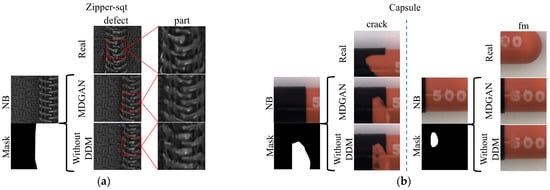 Without DDM. All DDMs were removed in the discriminator. The mask and image were channel-level connected and input into the discriminator. To match the formal experiments, the number of output channels of the first three convolutional layers was doubled. As shown in Figure 8, the discriminator’s binding on the defect quality decreased after removing the DDM. As shown in Figure 8a, the generated defects without DDM contained unrealistic stripes and the zipper teeth were not smooth enough, being totally different from the real images. In addition, as shown in Figure 8b, there were unreasonable black contents in the generated capsule-crack without DDM, while MDGAN smoothly stripped the black blocks and generated clear red defects on them. On capsule-fm, without DDM covered the annotated region with only fuzzy uniform white blocks, while MDGAN generated realistic and detailed scratches. That is, the networks could not inherit and generate the real defects without DDM. Overall, the addition of DDM assisted the discriminator in focusing on both on the whole image and the local defects, to improve judgment and enable MDGAN to accurately capture the stripes and grayscale distribution of defects and generate more realistic and higher quality images.